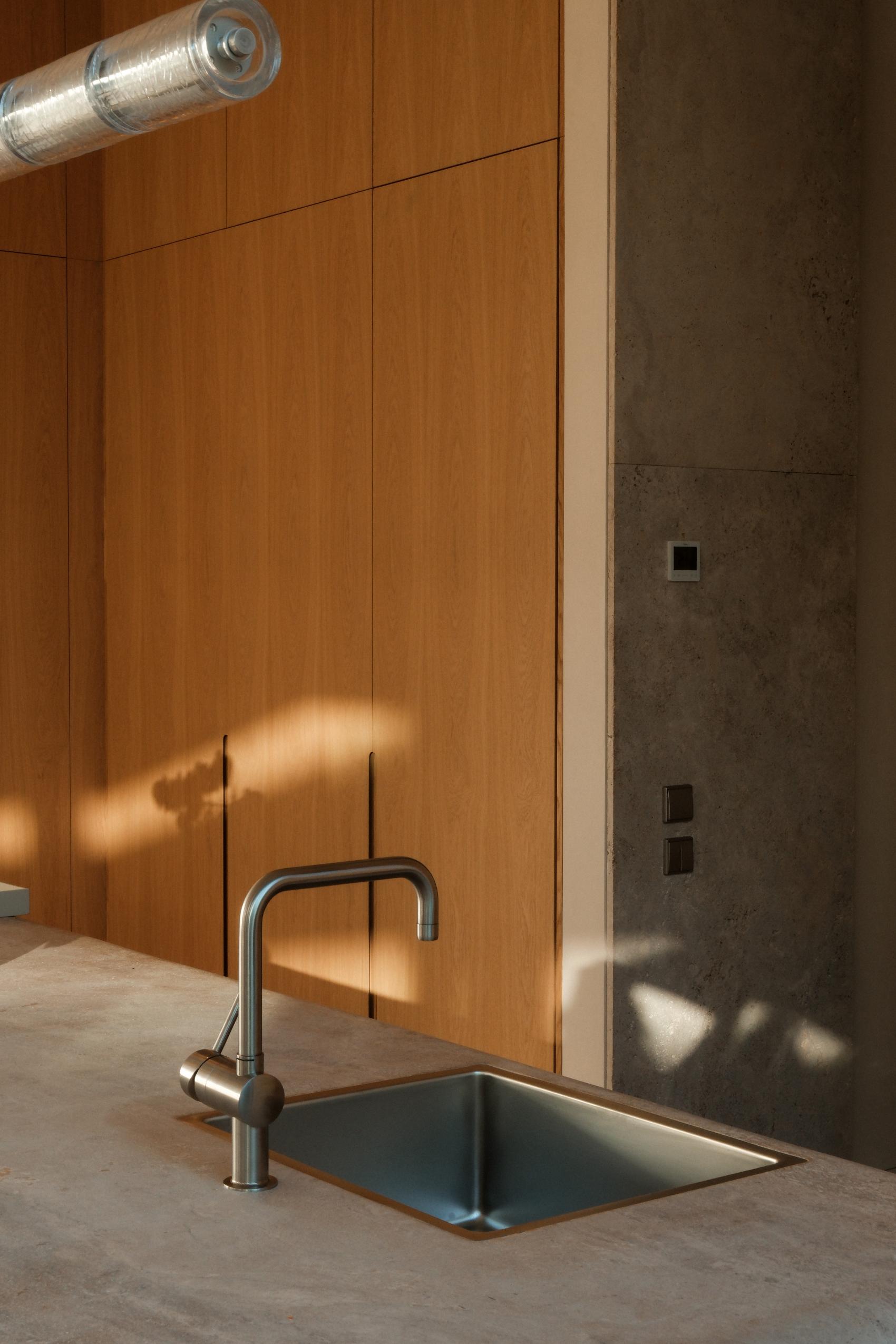 The monolithic island, spatially conceived and meticulously carved from a single solid stone slab, anchors the space with its raw texture and softened edges. Its sculptural mass is offset by the dining table’s minimalist glass surface, allowing light to pass freely and enhancing the sense of openness. Together, these elements embody Studio DesignBureau’s approach to material authenticity and poetic spatial design