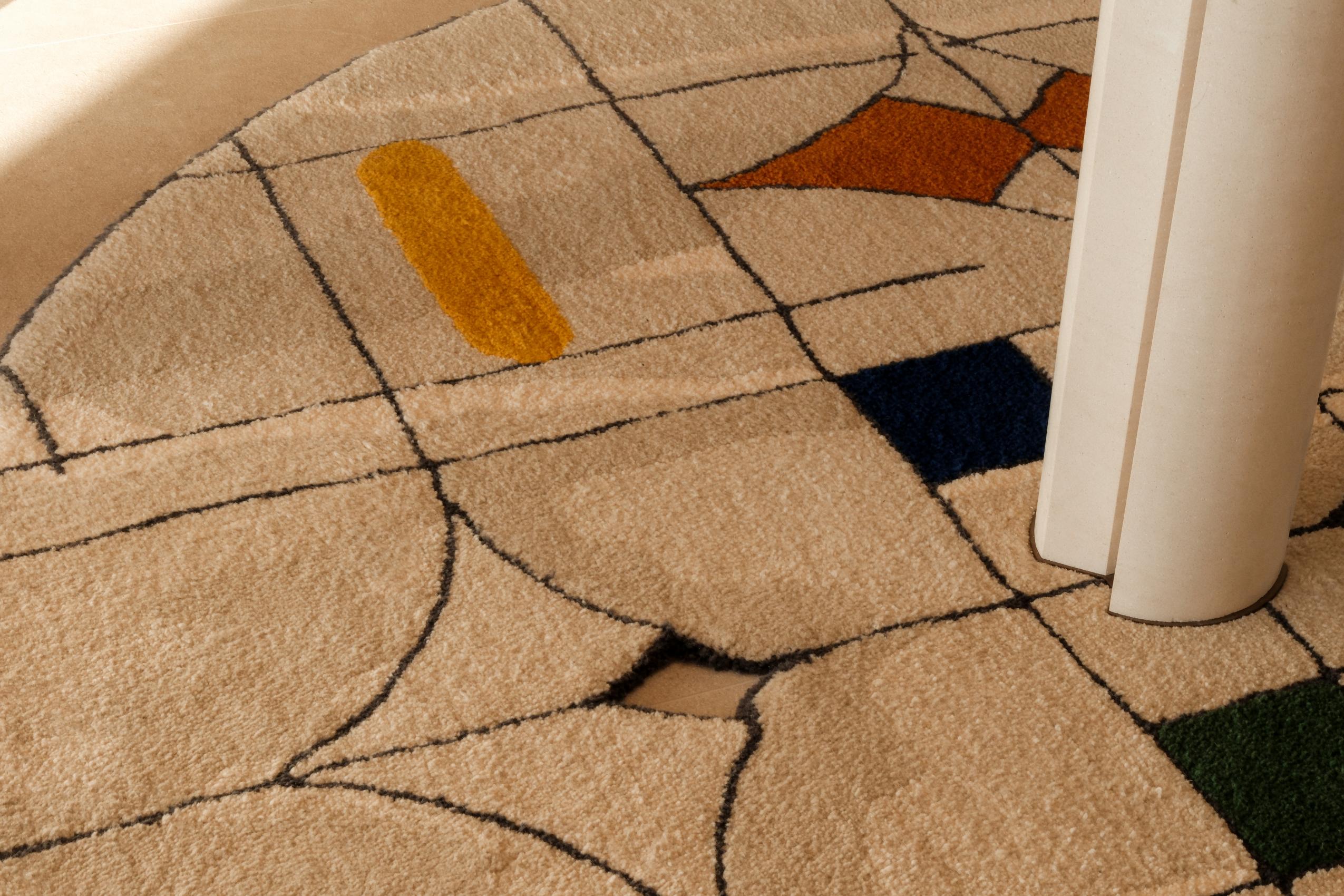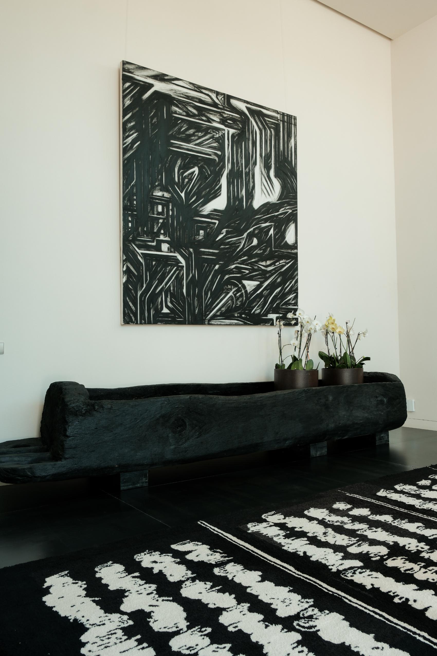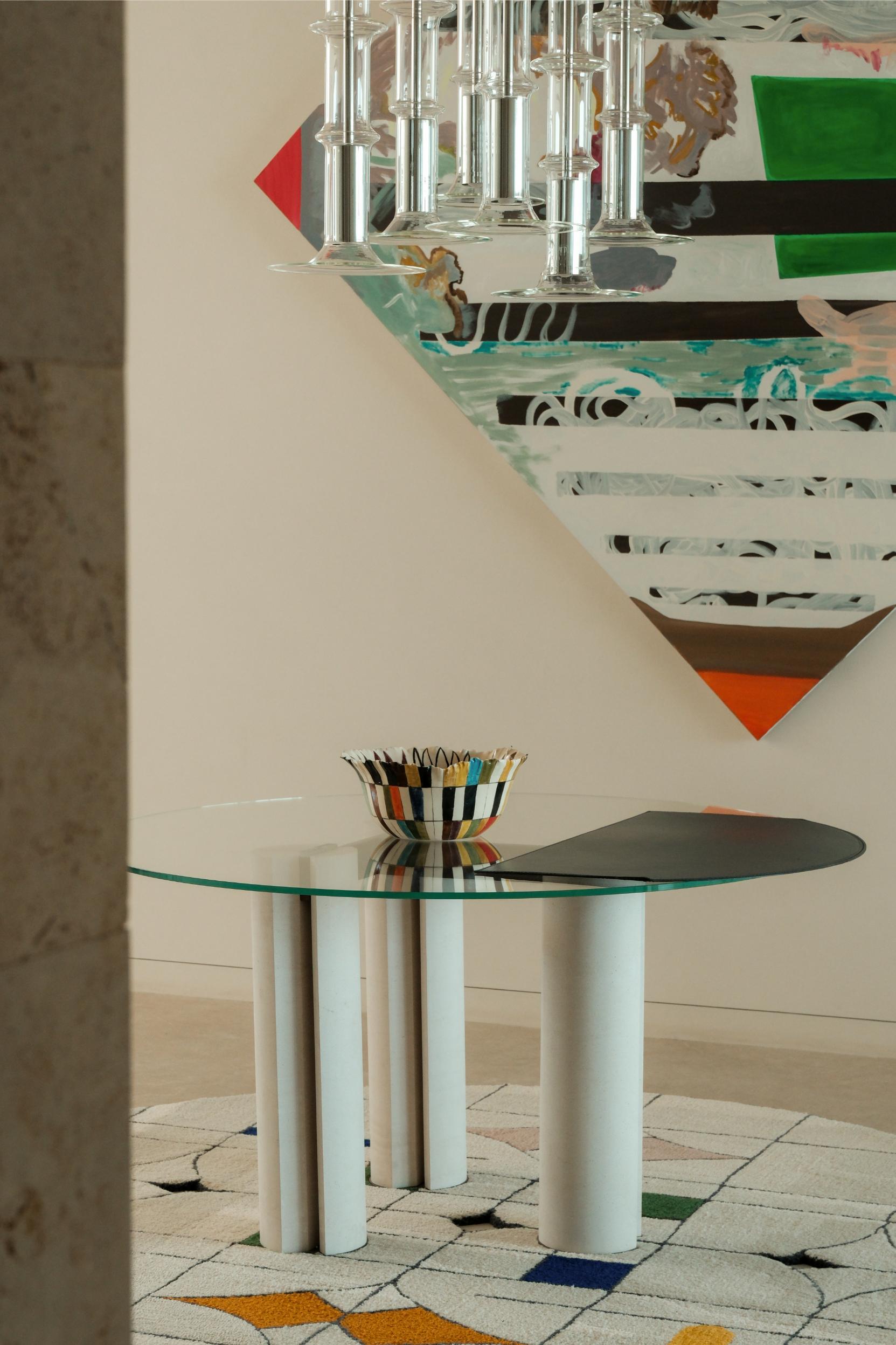 Curated pieces from Madam Bozarjiants—presented at Alcova during Milan Design Week—enhance the home’s collectible design narrative. In the entryway, the Crossed-Out Poem carpet and Floating Balance console reflect the gallery’s philosophy of preserving the beauty of imperfection.