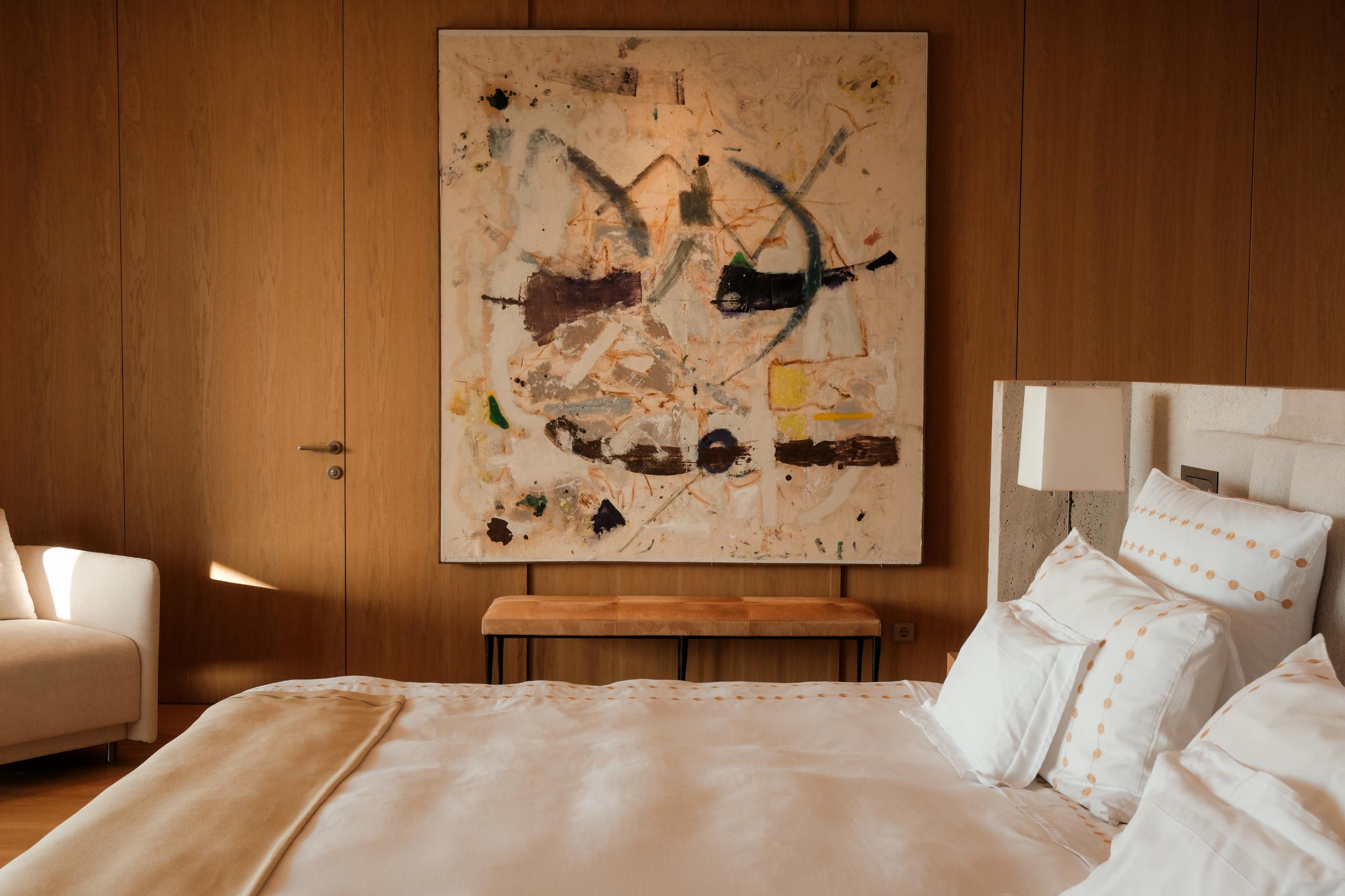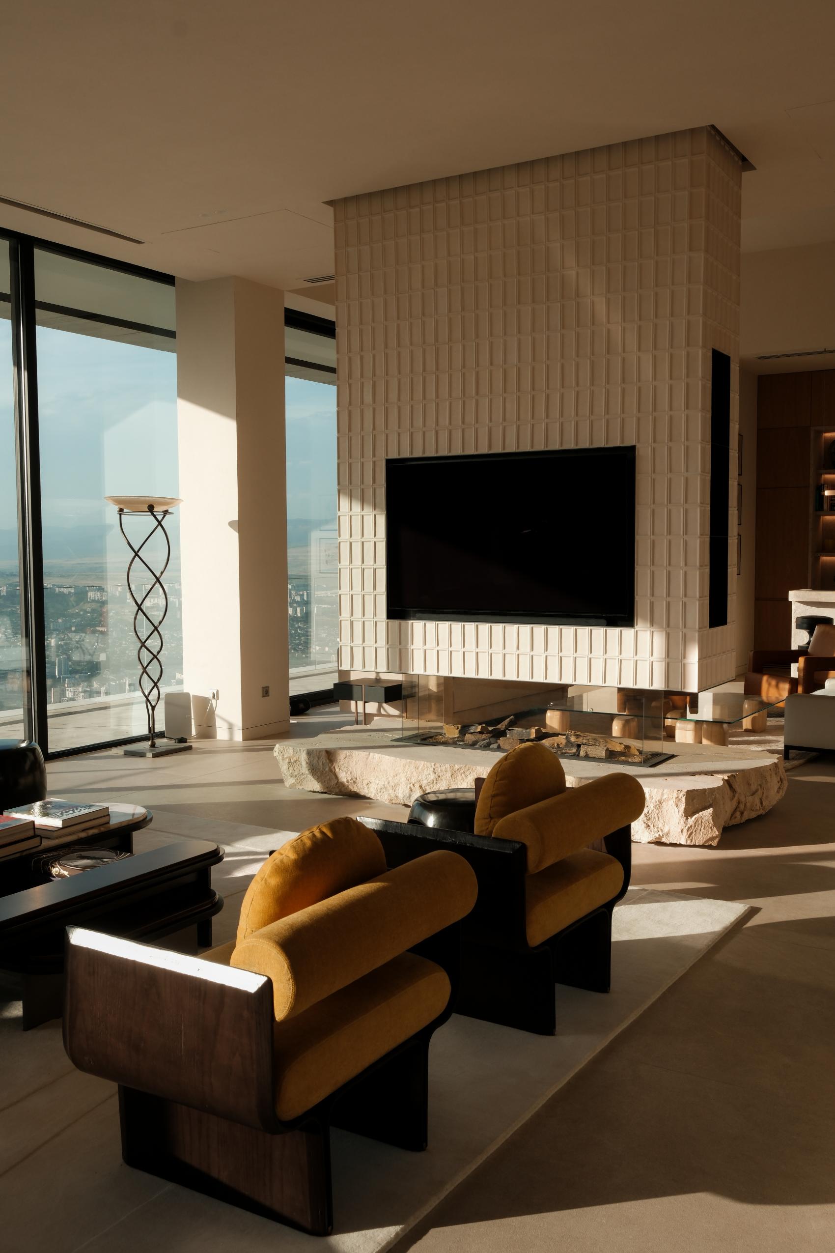 In the living room, a site-specific fireplace installation wrapped in handmade ceramic tiles hovers above a raw-hewn limestone slab. Collectible pieces punctuate the room: bronze stools by Christian Liaigre, whose sculptural forms convey quiet strength, and an aluminum painting by Zigie Ben Hime that captures fragmented urban narratives.Serge Lesage and Nani Marquina carpet collections softens the stone floors, Tamo Jugeli’s and Beso Uznadze’s abstract painting brings a distinctly Georgian voice into the space.