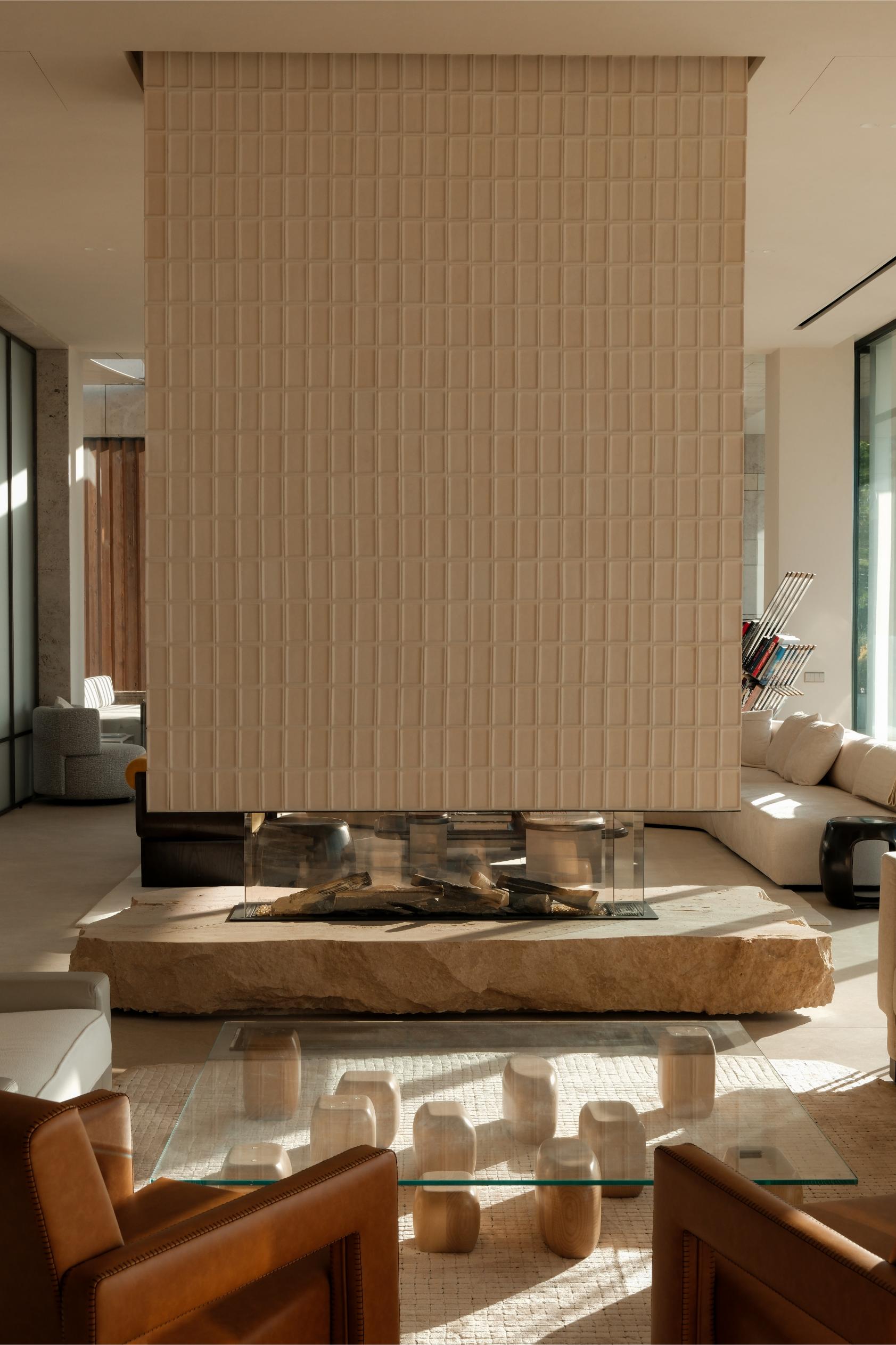 The hand made ceramic tiles of the fireplace envelop its floating form in a subtle grid, creating a sculptural centerpiece that is both functional and expressive. Across the room, Zigie Ben Hime’s aluminum artwork introduces a complex visual language of fragmented cityscapes and symbols, reinforcing the interior’s dialogue between materiality and storytelling.