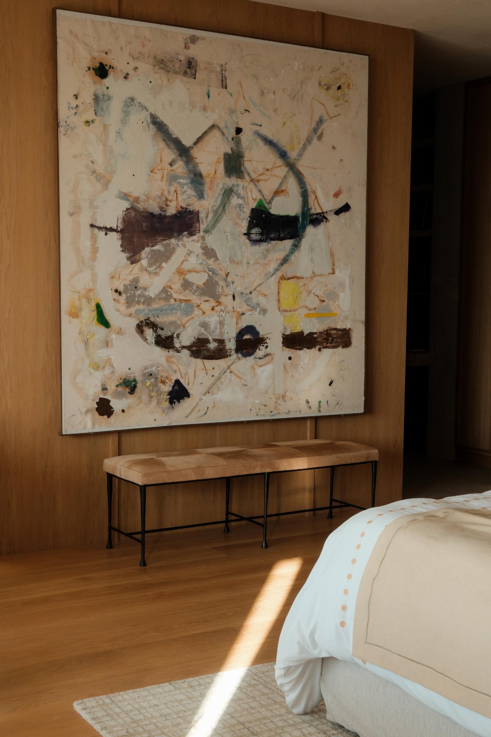 The Christian Liaigre bench, in cavallino leather with sculptural bronze legs , Dedar’s geometric curtain and an expressive abstract work by Beso Uznadze