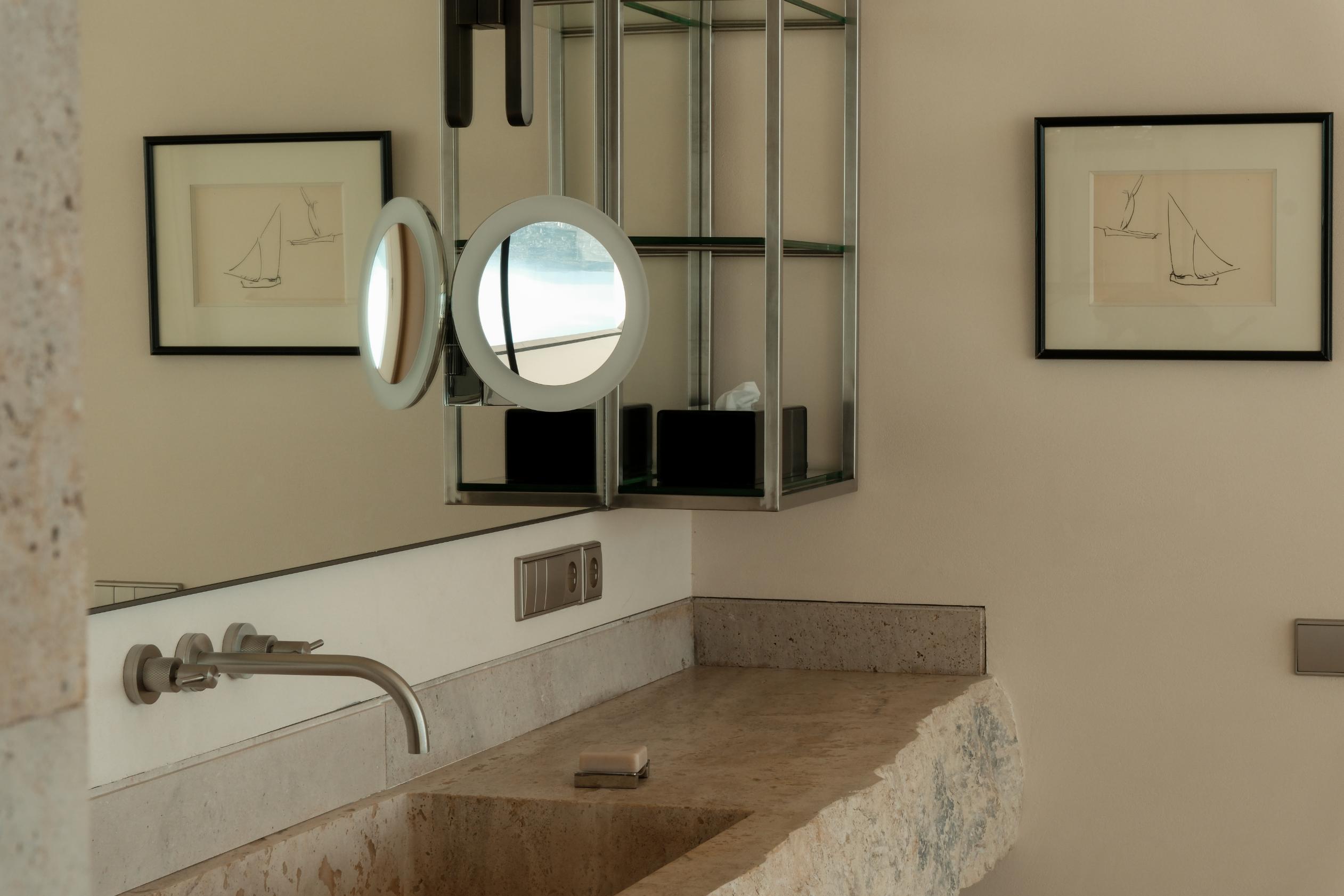 The collaboration extended into the smallest details. All bathrooms feature custom basins carved from solid stone slabs, their rough textures contrasting with sleek oak cabinetry and mirrored surfaces. The office continues this dialogue with bespoke shelving backed in natural stone, and a custom wood veneer desk resting on hand-finished stainless steel cylindrical legs. A graphic composition by Sol LeWitt adds conceptual rigor to the space.