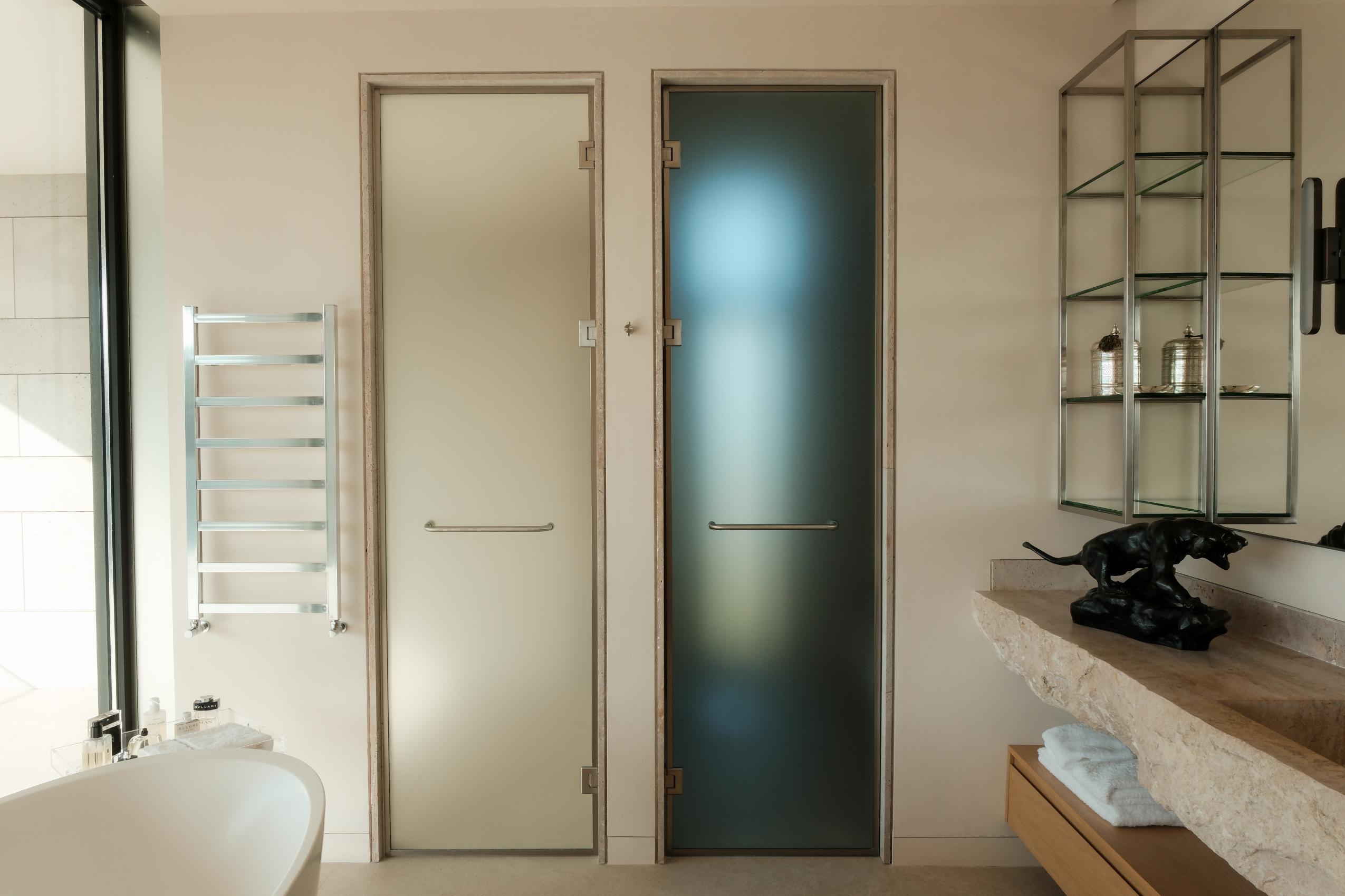 Each room celebrates a layered material palette. In the kitchen, a monolithic island spatially designed and carved from a single solid stone slab anchors the space. Its weight is balanced by a glass-topped dining table, a delicate counterpoint that allows light to flow through unobstructed. Overhead, a Kevin Reilly chandelier casts a poetic glow, while a Fornasetti divider provides a whimsical narrative moment.