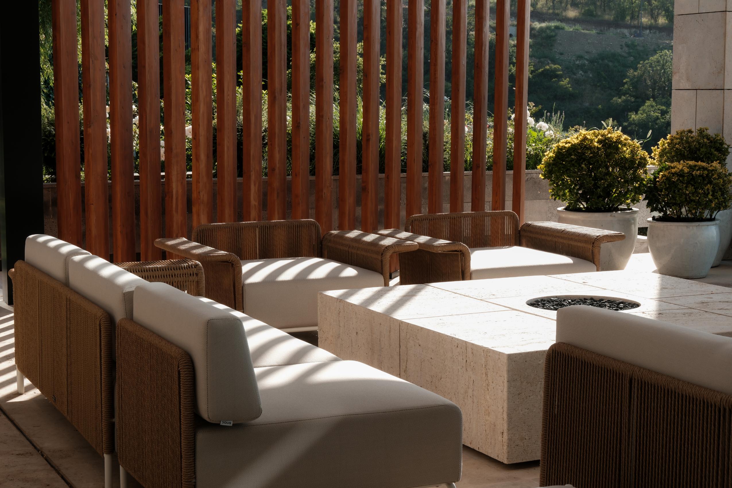 This site-specific installation transforms the outdoor dining wall into a sculptural meditation on existential themes. The hand-carved stone mural, with its sinuous, organic lines, symbolizes the search for clarity amidst inner chaos. The raw texture of the limestone contrasts with the polished stainless steel tables designed by Studio DesignBureau, while Snoc’s woven seating brings warmth and tactility to the minimalist composition. This deliberate interplay of hard and soft forms reflects the home’s overall narrative of tension and balance.