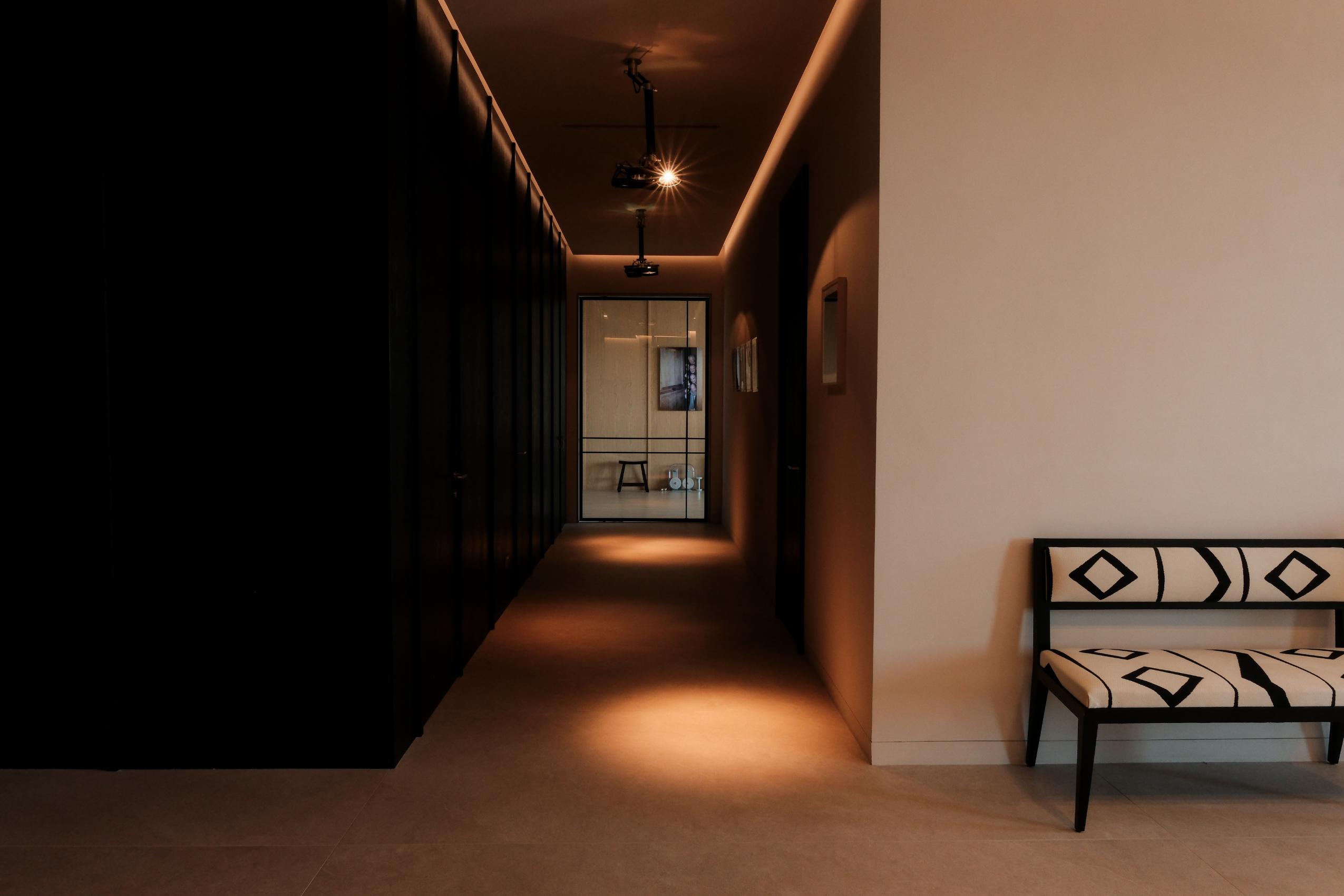 This transitional space expresses Studio DesignBureau’s focus on materiality and craftsmanship. The custom-treated metal floor, with its subtle patina and reflective qualities, sets the stage for collectible works by Madam Bozarjiants. The “Crossed-Out Love Letter” carpet adds bold visual texture, and the “Floating Balance” console — an interplay of glass and stainless steel — holds curated objects in a gallery-like arrangement.
