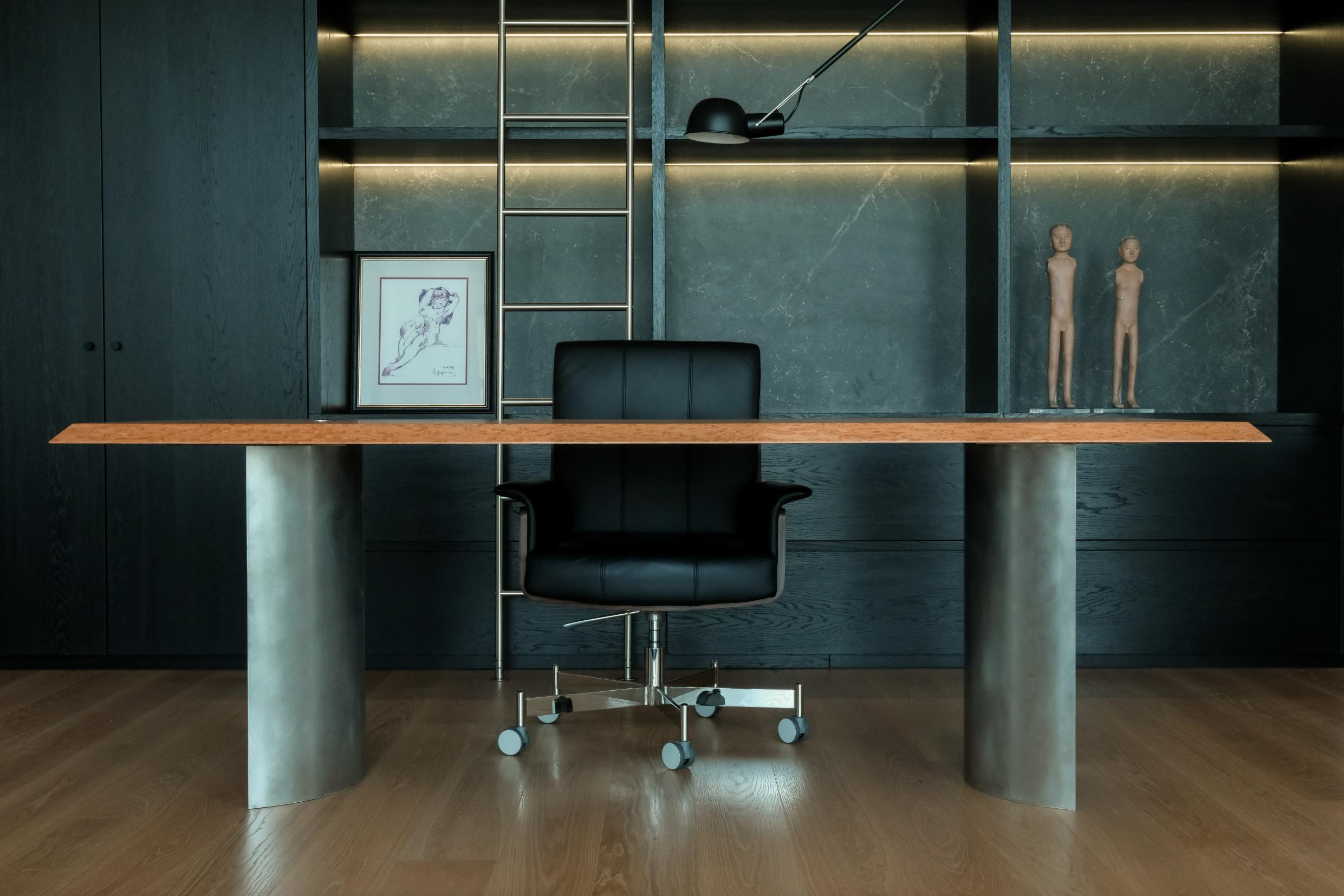 The office features bespoke shelving with a natural stone back panel and integrated lighting, paired with a custom-designed desk in rich wood veneer installed on handcrafted stainless steel cylindrical legs. A graphic work by Sol LeWitt adds a bold, conceptual note in interior